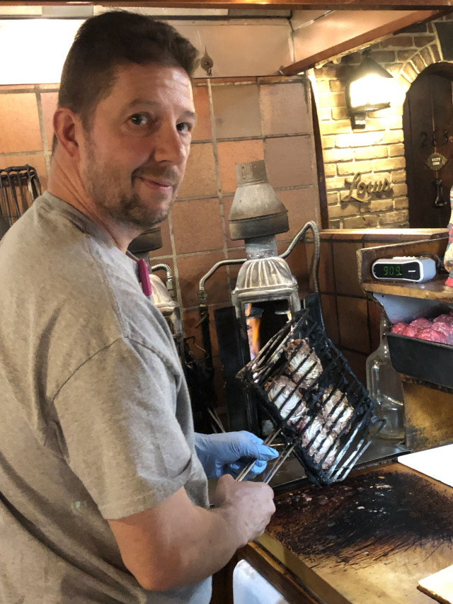 Y salimos a por la segunda parte de la cena en la más antigua hamburguesería de EEUU: Louis Lunch, de 1895. Al detenerse el Uber nos encontramos en el centro de la ciudad ante lo que parecía un kiosco de mampostería ocupando un trocito de un amplio solar-aparcamiento con escasa iluminación. Entramos y nos pareció irrumpir en una escena de una película del más antiguo cine mudo. Apenas 18 m2, también poco iluminados; rústicos bancos de gruesa y sobada madera fijados al suelo, una mesa, también comunal, y una barra en la que se apoyaba un parroquiano. Tras aquella, un hombre que nos pareció seco, mal encarado, incluso ebrio. En las paredes, fotos y recortes de prensa que hablan del local y un busto al carboncillo; es de herr Louis Lassen, emigrante alemán, fundador y tatarabuelo del dependiente: Jeff Lassen, quien continuaba mostrándose lacónico ante nuestras "obligadas" manifestaciones de entusiasmo. Respondía con desgana. Jeff es ese alemán orgulloso; si bien, pasado un rato se hizo más sociable e incluso nos sorprendió con la iniciativa de mostrarnos la preparación de sus hamburguesas. A la vista bolas de carne de vacuno picada, pan de molde y el infiernillo con el que ya su tatarabuelo comenzó el negocio; la tostadora es de 1928.