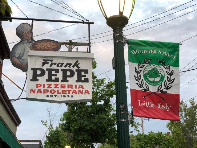 Llegamos a New Haven el 11 de mayo, día de graduaciones en Yale. Había hoteles llenos con estudiantes y familias. Pretendíamos cenar en Frank Pepe, que según diversas publicaciones hornea las mejores pizzas de los EEUU. Fue inaugurada en 1925 por un humilde inmigrante napolitano que revolucionó el famoso bocado con el empleo del carbón. De aquella época dan fe buen número de fotos de Frank y su esposa. Está en el barrio de Little Italy; un arco triunfal surge en una calle para dar la bienvenida a quienes acuden a comer en sus ristorantes y pizzerías. Nos topamos con una desmoralizadora cola en la calle; mas como el trabajo suele ser devoción, se esperó con resignación. Al rato nos asignaron una mesa, aun "caliente" y no bien aseada, en uno de sus dos bulliciosos comedores. Los restoranes medios norteamericanos suelen ser ruidosos; los comensales, en una especie de esquizofrenia coral, hablan en voz alta, gritan, ríen a carcajadas. Y, por otro lado, los cocineros no se esfuerzan en presentar platos con estética: montañas de comida -como hemos visto con los restoranes alemanes en nuestras urbanizaciones turísticas- o productos abigarrados en platos-bandeja. Las pizzas, sin embargo, son como en todo el planeta, de colores vivos, apetitosos... Y cuando fluye el aroma del orégano... Pedimos dos medianas, que son inmensas, "de almejas blancas" (sosas) (14,50$), sin queso y con panceta, que, obvio, da todo el sabor; y, siendo la "estrella", no nos entusiasmó; y la Frank Pepe's Original Tomato Pie: tomates escachados (tiene una industria de enlatados), Queso Pecorino Romano y oliva virgen que, aun con su sencillez, superó a la primera. Hoy, los nietos de Frank Pepe manejan una pequeña cadena, empleando mismo sistema, que opera en otras ciudades. Digamos, por último, que valió la pena solo por comprobar el fervor que profesa el norteamericano a ese icono gastronómico italiano. Universal.