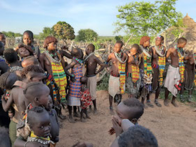 Salimos de allí un tanto decepcionados de la que parecía artificial parafernalia. Tras la comida realizada a medio camino, arribamos a la aldea Logio donde se ubica la tribu de los Hamer, muy característicos por sus peinados rojizos y ornamentación, amén de las escarificaciones corporales que se auto infligen. Destacan las mujeres de esta tribu por su gran belleza y que poseen cuerpos muy estilizados. También hay que realizar pagos por entrar a su aldea y como en todas, se ha de ir acompañado de un guía local que facilita todas las gestiones con ellos. Terminamos en día en la localidad de Turmi, alojados en el Hotel Kinzo Lodge. Sin duda el más descuidado y destartalado de todos, aunque tuvieron la deferencia de asar dos cabras para la cena en una inmensa hoguera, de buen sabor aunque bastante dura, debido a su edad.