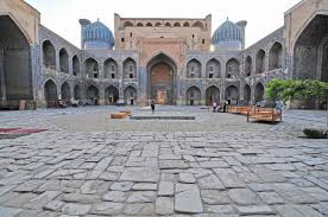 La figura legendaria de Amir Temur –Tamerlan– esta presente en los monumentos mas significativos de Samarkanda, como la Mezquita de Bini-Khanum y el Mausoleo de Gur Emir . El primero, por su grandiosidad y majestuosidad, pues su superficie era de 130 x 102 metros con mas de 400 columnas de mármol y una enorme cúpula exterior de techo dorado .En su tiempo la mezquita mas grande del mundo musulmán. Fue el amor por la esposa de Tamerlan , lo que inspiro al arquitecto para construir tan bellísimo edificio . Un amor que le costo caro, pues según cuenta la leyenda, el arquitecto solicito a Bini-Khanum un beso de recompensa por la maravillosa obra ; precioso beso que quedo grabado en la mejilla de la esposa, lo que enfureció a Amir Temur, quien ordeno ejecutar al arquitecto . El segundo, erigido a la memoria del que tenia que ser su sucesor , su nieto Muhammad Sultan , muerto en 1403 con 27 años de edad. El dolor por el fallecimiento de tan valiente heredero , digno sucesor de su abuelo, propicio la creación de un hermoso Mausoleo que años después se convertiría en morada definitiva del propio Tamerlan, de sus hijos y de sus nietos .
