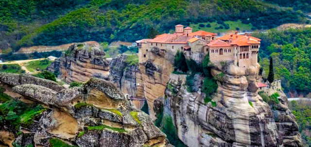Meteora es un lugar de apariencia surrealista. Sobre la tierra se levantan unas moles rocosas verticales que parece la geología de otro planeta. Pero sobre las cumbres de esas torres de roca, además, fueron construidos en el siglo XIV varios monasterios de retiro y oración. Todo comenzó con unos ermitaños que vivían en cuevas altas para estar más cerca de Dios. Después comenzaron a fundarse los monasterios, inaccesibles, aislados del mundo. Incluso hoy en día, que ya han sido habilitadas escaleras y accesos, para llegar a ellos hay que gastar esfuerzo y sudor. Desde arriba, desde sus terrazas, el vacío cae a plomo. Quedan en pie seis monasterios que se pueden visitar. Hay dos de visita inexcusable: el del Gran Meteoro –el más grande– y el de Varlaam. En ambos, los frescos de sus iglesias, bien conservados, emocionan y asombran. En el Gran Meteoro no puede dejar de verse el refectorio que, a pesar de los aditamentos de que está lleno, conserva a la perfección la vaga soledad de la vida monástica. En el valle, a apenas diez kilómetros, la ciudad de Kalambaka recibe a los curiosos. Desde la distancia, esta pintoresca ciudad, anclada siglos atrás, ofrece una magnífica imagen de Meteora. Una serie de colinas, similares a gigantescas columnas separadas, sobre las que se asientan los increíbles monasterios. Los cenobios se turnan para recibir a los visitantes y no romper su clausura. Tan solo alguna de las monjas o monjes, elegidos, pueden tener contacto con los turistas. Actualmente, sinuosas carreteras permiten llegar a la cima, aunque siempre hay algún atrevido que prefiere practicar la escalada.
