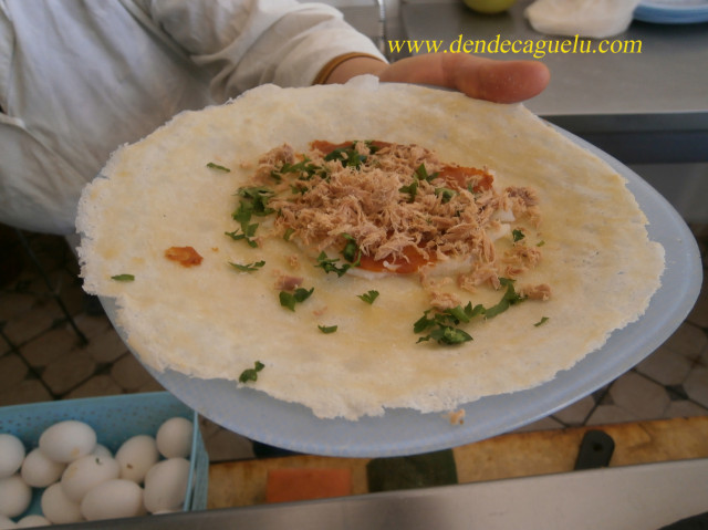 Realmente es una especie de empanada, que se prepara con un hojaldre fino que se elabora con una harina conocida como maluska, que se fríe en aceite de oliva y se rellena con diferentes productos, tanto salados como verduras, carne picada, pollo, marisco o atún, y que se sirve caliente con rodajas de limón, como dulces con frutos secos y miel.De todos ellos, el de huevo y atún es el más popular de todos ellos.