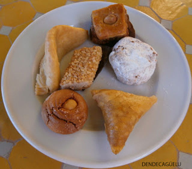 El apartado de postres, está compuesto principalmente por frutas, dada la gran riqueza frutícola del país. Su repostería, compuesta por elaboraciones refinadas, sin gran variedad, con base de miel, almendras y otros frutos secos, se acompañan siempre de té a la menta. Los dedos de gacela, briwat, baklawa, chebakias, o ghriybalkarkaa son de los más apreciados.