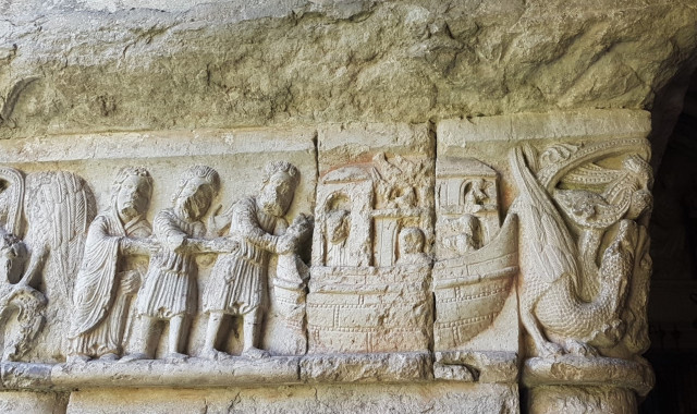 Antes de dejar la más pequeña de las cuatro capitales catalanas nos acercamos a la iglesia románica de Sant Pere de Galligants, En uno de sus capiteles encontramos una sirena con dos colas.