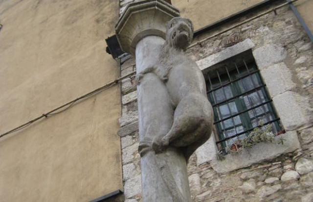 La plaza era una de las puertas de entrada a la ciudad. Allá encontramos una leona encaramada a una columna. Dicen que "el que besa el culo de la leona vuelve a Gerona" es la primera leyenda de nuestro recorrido, que recoge la costumbre habitual cuando la ciudad estaba amurallada, que debía besarse el trasero de la estatua para demostrar la obediencia a las normas de la ciudad.