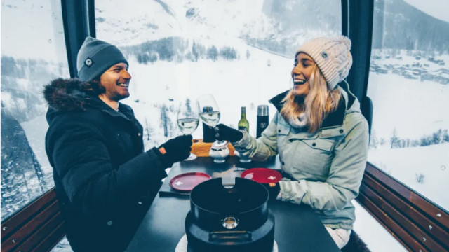 Ya vamos viendo que la fondue de queso no falta en casi ninguna de las propuestas divertidas que ofrece Suiza. Pero nada como disfrutarla en pareja en un teleférico a la luz de las velas en el columpio aéreo. Suiza es el país de los pioneros del teleférico y del queso. ¿La combinación de estas dos virtudes típicas? Comer una fondue en el funicular con todo lo que va con ella: vino blanco de Valais, té, aguardiente y un pequeño postre que están incluidos en el precio. El viaje nocturno con fondue dura una hora. El telesilla está equipado con mantas y pieles para que nadie pase demasiado frío y velas para hacer el paseo aún más romántico.