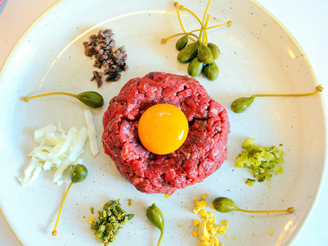 Steak Tartare (Solomillo de ternera de los Norteños cortado a cuchillo y preparado en mesa al gusto) o Dorada a la sal (también preparada en mesa)