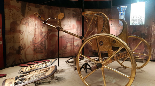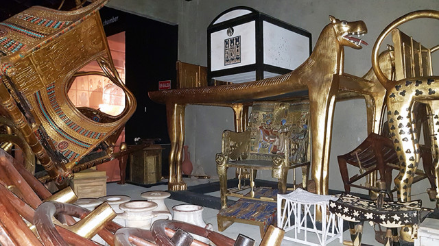 Muchas de las piezas reproducidas están rematadas con oro, como las originales, o cuentan con un recubrimiento de pan de oro y son tan minuciosas que se han mantenido, incluso, los errores originales, los pequeños gazapos que se les deslizaron a los orfebres y escribas egipcios en el momento de preparar el ajuar. En la tumba original se encontraron 5.300 objetos, muchos de ellos de oro y adornados con piedras preciosas y se tardaron más de diez años en vaciar completamente la tumba. Algunas piezas menores forman parte de la colección privada de lord Carnarvon, que financió las excavaciones y de varios museos del mundo, no siempre obtenidas de forma lícita.