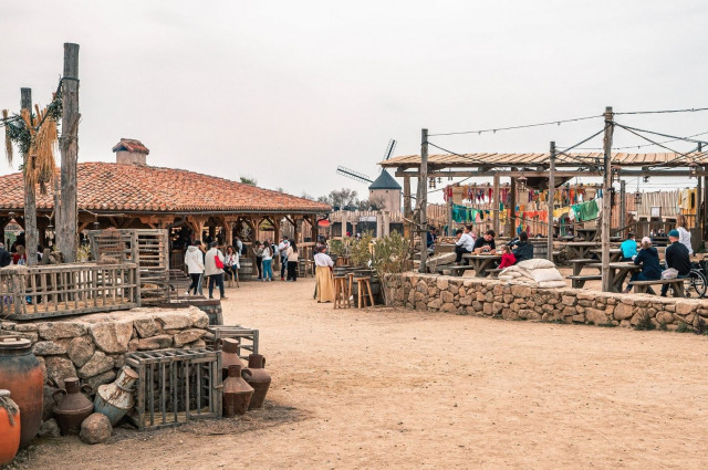 Un primer recorrido por el parque permite descubrir los cuatro pueblos y aldeas muy bien recreados y, de paso, ir eligiendo los lugares donde comer y hacer compras. Hay mucho donde elegir: nada menos que 24 restaurantes, bares y terrazas y una docena de talleres artesanos y sus respectivas tiendas. El primero que se encuentra, y el último al finalizar el espectáculo, es El Arrabal, nombre que en la antigüedad gente de todos los orígenes y culturas desempeñaban sus actividades comerciales, hoy los visitantes de Puy du Fou España pueden disfrutar de lo mejor de la gastronomía española –y otra no tan buena pero rápida– en un entorno inspirado en el siglo XIII. Desde la parrilla de El Rincón del Herrero hasta la cerveza artesana de El Llagar de Covadonga, en El Arrabal se puede disfrutar en familia, o entre amigos, de amplias terrazas durante todo el día. Es el sitio perfecto para hacer una pausa antes de seguir con el viaje en el tiempo. La Puebla Real está dedicada a los artesanos. Paredes de piedra y vieja madera, puertas arqueadas y antiguos tejados, que acogen a los mejores artesanos de la ciudad: damasquinadores, bordadores o alfareros, entre otros; además de otras estancias como La Casa del Judío o El Salón de Armas. Personajes como el Tuerto Miguel, que escancia los mejores vinos del lugar en su Bodeguita, o María del Valle, que sirve los más exquisitos platos castellanos para degustar en su Mesón del Buen Yantar son buenas opciones. El Askar Andalusí reproduce el campamento del gran califa Abderramán III, los fastos de Al-Ándalus. Ahí, entre jaimas, se descubre la vida cotidiana de un auténtico campamento morisco. Se encuentran oficios como maestros cereros y vidrieros, mientras se huele a miel y almendras procedentes de El Alatar de La Favorita, donde se pueden comer productos de gran tradición omeya. La visita a Puy du Fou España merece una parada en La Venta de Isidro. Aquí se puede descubrir la vida rural de la Edad Media. Detalles tan realistas que harán sentirse uno más de la época. Un descanso mientras se prueba los mejores productos directos de la tierra al plato.