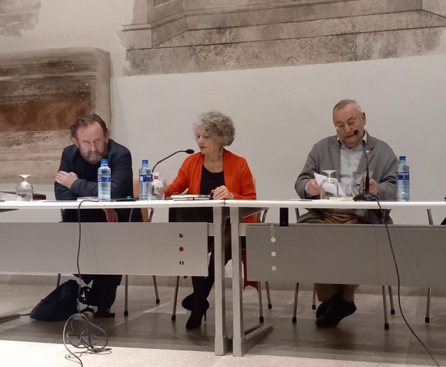 Acompañaron a Concha Pelayo en la presentación, Fernando Primo, profesor, Francisco Somoza, arquitecto y artista, autor de los dibujos de portada e interior del libro; ambos con experiencias en la cárcel por haber impartido charlas y diferentes talleres y también, Daniel Domínguez, periodista y amigo de la escritora. Todos ellos expusieron su punto de vista sobre CONDENA, manifestando que es una interesantísima publicación que todo el mundo debe conocer pues abre la puerta a muchos debates, necesarios en esta sociedad. El mundo de las cárceles es muy cerrado y del que pasamos de puntillas. Inconscientemente lo hacemos invisible. Concha Pelayo, dotada de una gran empatía desgranó algunas pautas para establecer una mayor comunicación entre los internos y la sociedad, incluida la sociedad estudiantil.