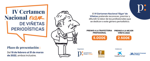 La Asociación de la Prensa de Málaga (APM) y la Fundación Manuel Alcántara convocan la IV edición del Certamen Nacional ‘Elgar’ de Viñetas Periodísticas dotado con 7.500 euros en premios en sus dos modalidades: Trayectoria Profesional (5.000 euros) y Mejor Viñeta Periodística de 2022 (2.500 euros). El plazo de admisión de candidaturas permanecerá abierto desde hoy, 15 de febrero, al 31 de marzo, ambos inclusive, tal como establecen las BASES. Los galardones cuentan en esta edición